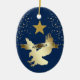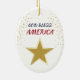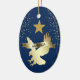 Here's a pretty patriotic Christmas ornament that is unique! The front features a glittery gold star and a shiny silhouette gold eagle about to land. Across the eagle's wings is a gold banner that says AMERICA. Glittery gold confetti decorates the left and right sides, and everything is placed on a dark blue background. The back of the ornament is white, with the same gold confetti borders, a larger gold star, and your custom text contained in a blue field and a red field.
