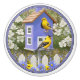 A pair of American Goldfinches perch on a cute purple birdhouse in a beautiful spring garden filled blue and yellow daisies lining a white picket fence. In the background is a lovely jacaranda tree covered with purple blossoms, surrounded by flowering dogwood. Original artwork created by wildlife artist Crista S. Forest.