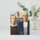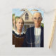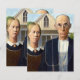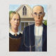 This is the classic Grant Wood painting, American Gothic, showing a farmer and his wife standing in front of their farmhouse, he with his pitchfork, her looking sidways at him.