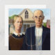 This is the classic Grant Wood painting, American Gothic, showing a farmer and his wife standing in front of their farmhouse, he with his pitchfork, her looking sidways at him.