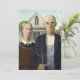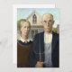 Postcard with reproduction of American Gothic painting by Grant Wood. A painting of a man and woman with stern expressions standing side-by-side in front of a white house. The man holds a pitch fork. Painting depicts a farmer standing beside his daughter – often mistakenly assumed to be his wife. The painting is named for the house's architectural style. Carpenter Gothic, also sometimes called Carpenter's Gothic or Rural Gothic, is a North American architectural style-designation for an application of Gothic Revival architectural detailing and picturesque massing applied to wooden structures built by house-carpenters. American Gothic is one of the most familiar images of 20th-century American art.