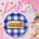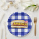 Hot dog with America text in mustard on blue and white buffalo plaid for 4th of July or any other patriotic American holiday.