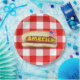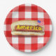 Hot dog with America text in mustard on red and white buffalo plaid for 4th of July or any other patriotic American holiday.