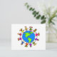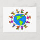 Cute and diverse happy kids holding hands around a globe featuring the map of North and South America.