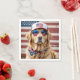 A golden retriever, outfitted with aviator sunglasses, an American flag on a cap, and a matching bandanna poses in front of an American flag.
