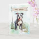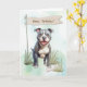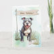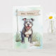 Strong and sweet, the Pit Bull Terrier rests in the soft grass, eyes filled with affection and loyalty. A “Happy Birthday” banner above and a nearby bone complete the outdoor scene, making this card a wonderful choice for someone loving, brave, and full of heart.