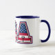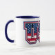 This custom coffee mug features a design that displays the word "USA" in a bold Stars & Stripes flag print font and red, white, and blue coloured letters plus black outline in this pride of the USA theme. The rim & handle are glazed in matching colours available in 11-ounce or 15-ounce sizes microwave and dishwasher safe ceramic construction.