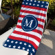 Celebrate the Fourth of July and summertime at the pool or beach in patriotic style! This monogrammed beach towel features a United States of America flag inspired design with stars and stripes in classic red, white, and blue American colours. Personalise the custom monogram with your family's last name initial letter.