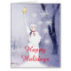 A fun patriotic snowman character dressed as the statue of liberty , with a bright red white and blue flag scarf and winter snowflakes on a pretty winter snowscene, easily add your own personal message to the inside of your card to create a unique professional patriotic American festive card this Xmas holiday, easily change the happy holiday text to Merry Christmas.