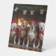 An enchanting scene captures the essence of cosiness and holiday spirit as furry companions adorned in Santa Claus hats gather around a crackling fireplace. The warmth emanating from the hearth creates a snug atmosphere for these adorable canines, while festive stockings hang in the background, enhancing the merry ambiance. The charming illustration portrays a timeless image of companionship and festive joy, perfect for celebrating the holiday season with a touch of canine charm.