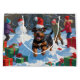 A heartwarming holiday illustration featuring a cheerful dog playing in the snow, wearing a Santa hat and surrounded by colourful gift boxes. In the background, children build a snowman beside a snow-covered Christmas tree, creating a joyful winter wonderland. Perfect for spreading holiday cheer and capturing the magic of Christmas.