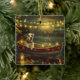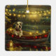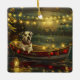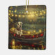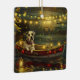 Set sail into the magic of the holiday season with this beautifully detailed illustration, showcasing a proud dog sitting in a festively decorated boat, gliding across a serene Christmas lake. The twinkling lights from nearby pine trees reflect off the water, casting a warm, festive glow that enhances the cosy ambiance. Ornaments dangle from the boat's sides, while glowing lanterns light the way, creating a scene that captures the true essence of Christmas warmth and joy. This nostalgic artwork brings a touch of holiday magic to any space, perfect for those who cherish the spirit of the season.