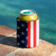 This custom can cooler features a design that displays the Stars & Stripes of the American flag print with a red, white, and blue coloured with an all over print style in this pride of the USA theme. Our can coolers fits any standard 12 oz cans and is customised on all sides including the bottom and made with high-density open-cell polyurethane collapsible foam material for easy storage.