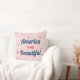 Stylish patriotic Fourth of July holiday throw pillow design features an "America the Beautiful" quote script typography text design in red, white, blue, and navy blue colours with star accents and light pink background colour.