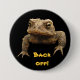 A grumpy looking American Toad (Bufo americanus) is looking out at you from this button. This small amphibian is brown with black, gold olive green and orange coloration. His warts distinguish him from his frog neighbours. Although hatched in the water of ponds, rivers, lakes or streams, the tadpoles soon move to land where the toads live their adult lives. His startling call is a long screech. He looks quite fierce but is actually a gentle little guy who eat lots of garden pests including insects and slugs. The text reads: Back off. It can be customised or removed.