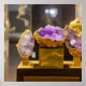Amazing photorealistic digital art poster with an AI generated image of a beautiful trio of amethyst crystal geodes on gold pedestals as if displayed in a museum
