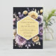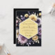 A dramatic and elegant floral design sets a romantic mood for your special day. Against a deep charcoal background, a luminous bouquet artfully blooms in shades of soft amethyst, lavender, and buttery yellow. Lush painterly peonies and roses create a moody and artistic composition perfect for an enchanting evening affair.