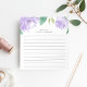 Chic floral notepad features a top border of watercolor peony flowers in lavender purple with lush green leaves. Personalise with two lines of custom text in modern lettering; shown with the French greeting "bonjour" and your name. Lined.