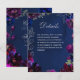 A stunning amethyst purple, sapphire blue and navy blue jewel tone wedding invitation Details enclosure card featuring a symphony of deep purple, burgundy and raspberry pink red peonies adorned with silver spray and shimmering silver outlines on a navy blue watercolor-wash background with your names in silver rustic script and a small uppercase non serif font announcing your details.