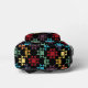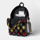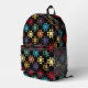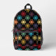 This backpack is patterned to look like an Amish quilt with an Ohio Star quilt block print in red, purple, blue, yellow, gold, orange and green set against a black background.