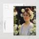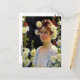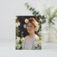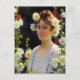 A fine art postcard with the painting by Charles Courtney Curran (1861-1942) an American Impressionist artist, titled Among the Hollyhocks (1904). A portrait of a young woman in a white dress with auburn hair surrounded by yellow and red hollyhock flowers.
