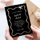 This chic and elegant wedding invitation features a hand drawn, wavy illustrated frame in real rose gold foil with a bow, and stylish ivory handwritten script on an dark black background for a Parisian or French style wedding invitation.