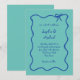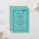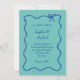This chic and elegant wedding invitation features a hand drawn, wavy illustrated frame in marseilles blue with a bow, and stylish handwritten script on a colourful teal background background for a Parisian or French style wedding invitation.