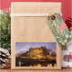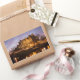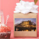 Rectangular photo sticker with Amsterdam canal houses in traditional style next to a bridge over Prinsengracht and Brouwersgracht canals illuminated at dusk during Blue Hour in the Netherlands.