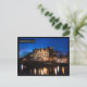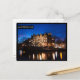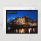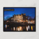 Postcard of the romantic old houses of Amsterdam city, built along Prinsengracht canal, with reflection of the lights in the still water at the beginning of the night in the capital of Holland with a black edge and the text 'Amsterdam'.