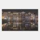 Rectangular photo sticker with traditional architecture canal houses with colourful lights and reflection in the water at night in the Red Light District in the city centre of Amsterdam, the Netherlands.