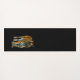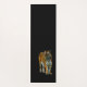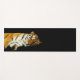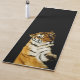 A black yoga mat with a photograph of a sleeping tiger on one side and an awake, standing tiger on the other side.