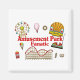 Featuring all things fun at the amusement park! A roller coaster, bumper cars, spinning ride, ferris wheel popcorn, cotton candy, soda pop, pretzel, arcade token, and colourful snow cone.