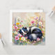 A blank card featuring an adorable sleepy skunk napping in a bed of pink and yellow flowers.