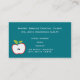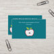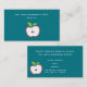 Dental themed professional business card template. A drawing / illustration of an apple with a thick red outline and 2 black seeds in the centre and 2 green leaves on top. Teal background.