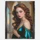 An Enchanting Portrait of The Emerald Empress AI Concept Art by Xzendor7; showcases a beautiful young empress adorned in an exquisite aqua-green gown that perfectly complements her striking, vivid green eyes. Read The Story At: https://xzendor7.com/an-enchanting-portrait-of-the-emerald-empress/