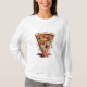 Imagine a playful, cartoon-style illustration of a slice of pizza designed for a t-shirt. The pizza slice has vibrant, bold colours, with gooey, melting cheese drizzling off the edges. The crust is golden-brown with a slight texture, and it's slightly tilted to give the slice a fun, dynamic look.