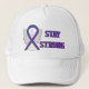Purple and green ribbon awareness is displayed on this customisable hat or cap showing support for the cause of anal cancer. Text on hat or cap notes "Stay Strong". Customise the font of the hat to any preferred personalised saying. The purple and green awareness ribbon shows support for the cause of anal cancer. Wear this hat or cap during fundraiser walks, chemo support, or other awareness events to remember to "Stay Strong". This hat or cap makes for great cancer gifts.