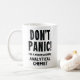 This charming white mug features the phrase 'Don't Panic! I'm A Professional Analytical Chemist.' It's the perfect work mug for those in the chemistry field, ideal for office use, team gifts, or celebrating achievements in research and development.