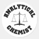 Analytical Chemist - white sticker with black collegiate style lettering and antique balance graphic.