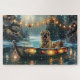 Set sail into the magic of the holiday season with this beautifully detailed illustration, showcasing a proud dog sitting in a festively decorated boat, gliding across a serene Christmas lake. The twinkling lights from nearby pine trees reflect off the water, casting a warm, festive glow that enhances the cosy ambiance. Ornaments dangle from the boat's sides, while glowing lanterns light the way, creating a scene that captures the true essence of Christmas warmth and joy. This nostalgic artwork brings a touch of holiday magic to any space, perfect for those who cherish the spirit of the season.