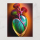 "The Heart Beats" a modern and artistic digital art postcard featuring a colourful anatomical teal glass heart with magenta veins. An alternative perhaps to the traditional Valentine, created using AI generating software.