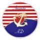 A white Anchor over a red heart, outlined with rope, sitting on a red and white striped background and blue. You can personalise this design with a name, monogram or other short text.