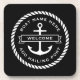 Coaster featuring an anchor with a ribbon banner across it with customizable text "welcome". Add your boat name above and hailing port below. Around the anchor and text is a round rope border. White design on black background.