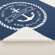 Sherpa blanket featuring an anchor with a ribbon banner across it with customisable text "welcome". Add your boat name above and hailing port below. Around the anchor and text is a round rope border. White design on dark blue background.
