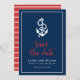 Stylish Nautical Save the Date featuring an anchor and the words "save the date" in a stylish red script against a blue background with a white border. Card has a white stripes pattern against a red background back side. Check out other wedding items here https://www.zazzle.com/rosewoodandcitrus/gifts?cg=196540141241316965&rf=238364477188679314
