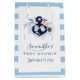 Joyful and creative beach baby shower design combining nautical elements (navy anchor, knot, starfish) with beautiful floral bouquets of blue hydrangea, blush pink and white anemone flowers, eucalyptus leaves, dahlia, and greenery. Navy lettering. Light blue stripes on the back. Gender neutral. Truly unique. Ideal for beach baby shower, nautical baby shower, summer baby shower.