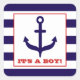 A baby shower sticker featuring an illustration of a blue anchor over a background of blue stripes. Text says "It's A Boy!"