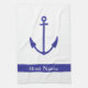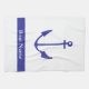 A boat galley towel with a navy blue anchor and a place to put the name of your vessel ; customised boat galley towel custom personalised
