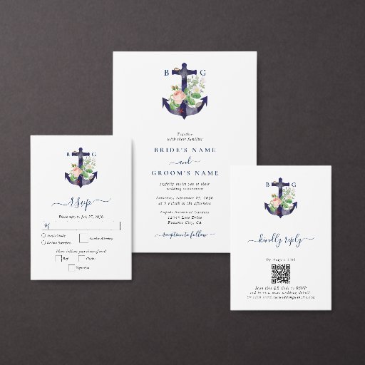 A minimalist botanical floral anchor monogram wedding design. A simple nautical design that uses a watercolor anchor decorated in floral, seashells and starfish creating a unique monogram. A charming navy blue and white stripes tropical beach design with classy script typography. An elegant coastal beach themed wedding invitation design with modern elements. Matching wedding stationery items and other wedding invite formats are also available.
