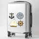 Nautical icons; anchor, compass rose, boat and ship's helm.